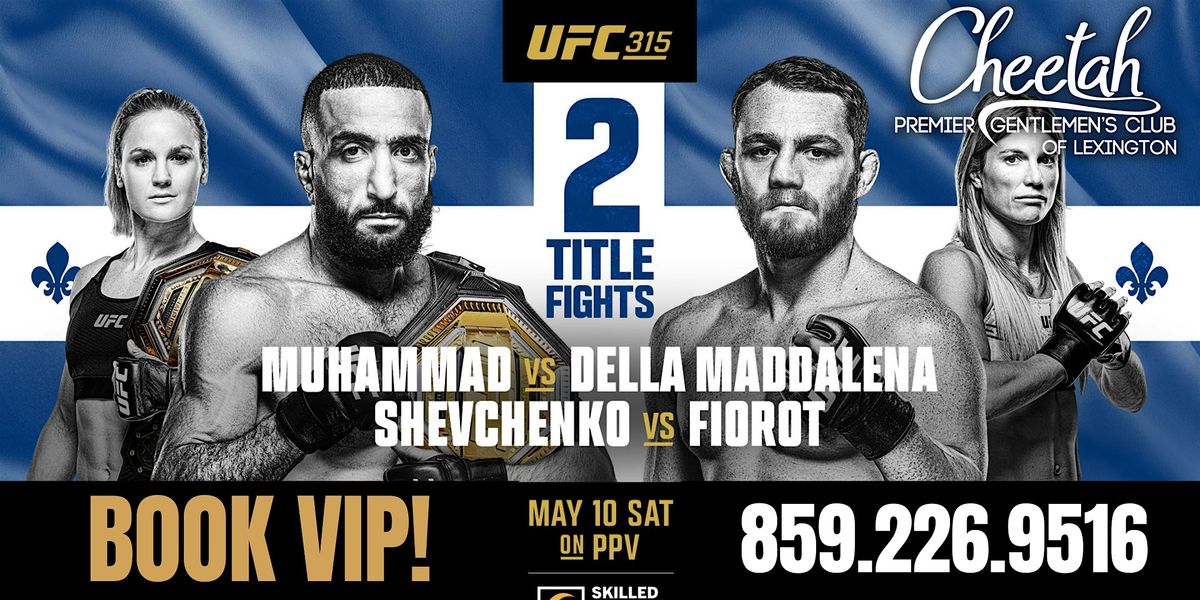 UFC 315 Muhammad vs Della Maddalena! is the event you don't want to miss! Join us at Cheetah Lexington on Sat. May 10 for an action-packed night of fights. Witness the intense battle between Muhammad and Della Maddalena as they go head to head in the octagon. Get ready for an evening filled with excitement, adrenaline, and unforgettable moments.