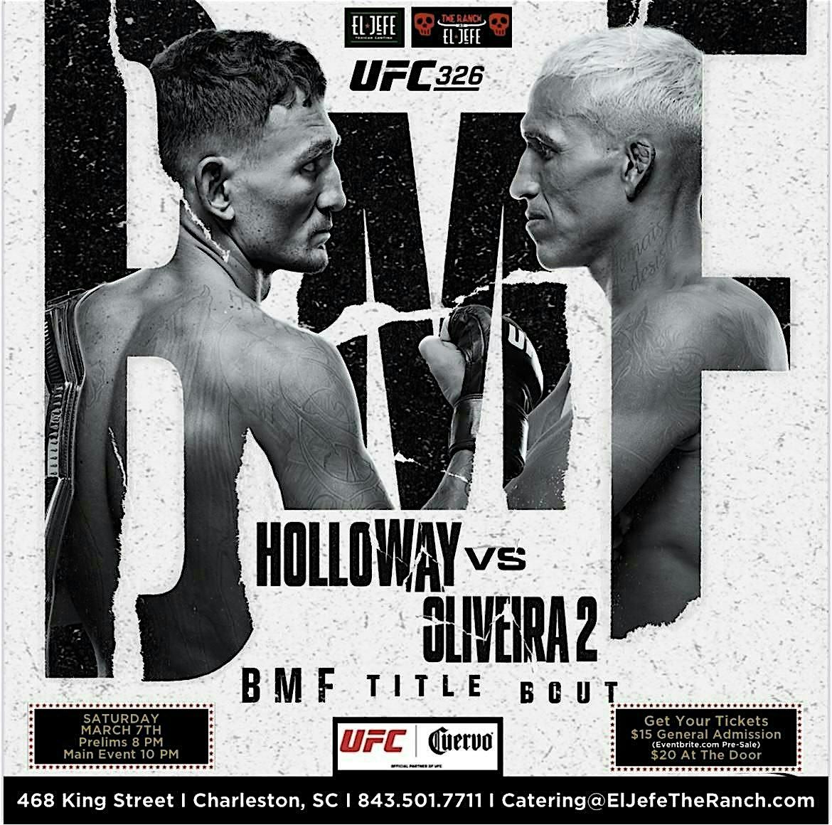 Join us for UFC 326 at El Jefe Texican Cantina downtown Charleston! Holloway vs Oliveira 2 outside at The Ranch! Prelims start at 8pm
