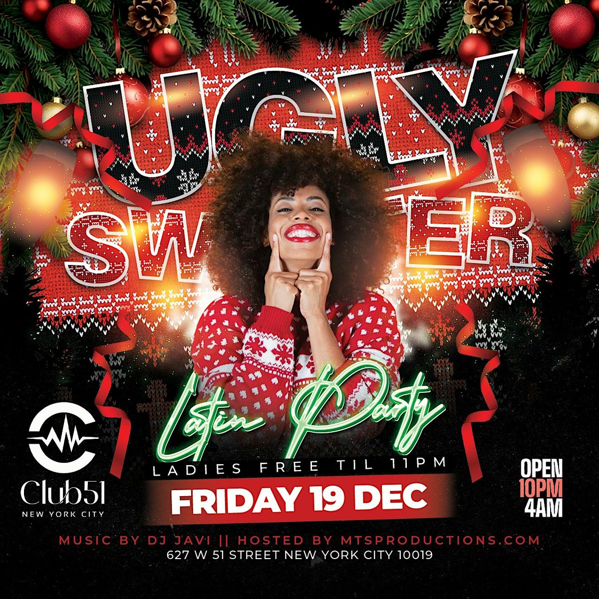 Get ready to deck the halls and the dance floor! Join MTS Productions for the ultimate Ugly Sweater Latin Party this Friday, December 19th at Club 51 NYC — the perfect way to celebrate the holidays with friends, festive drinks, Latin beats, and tacky sweaters. Follow us on or for upcoming events or free giveaways.