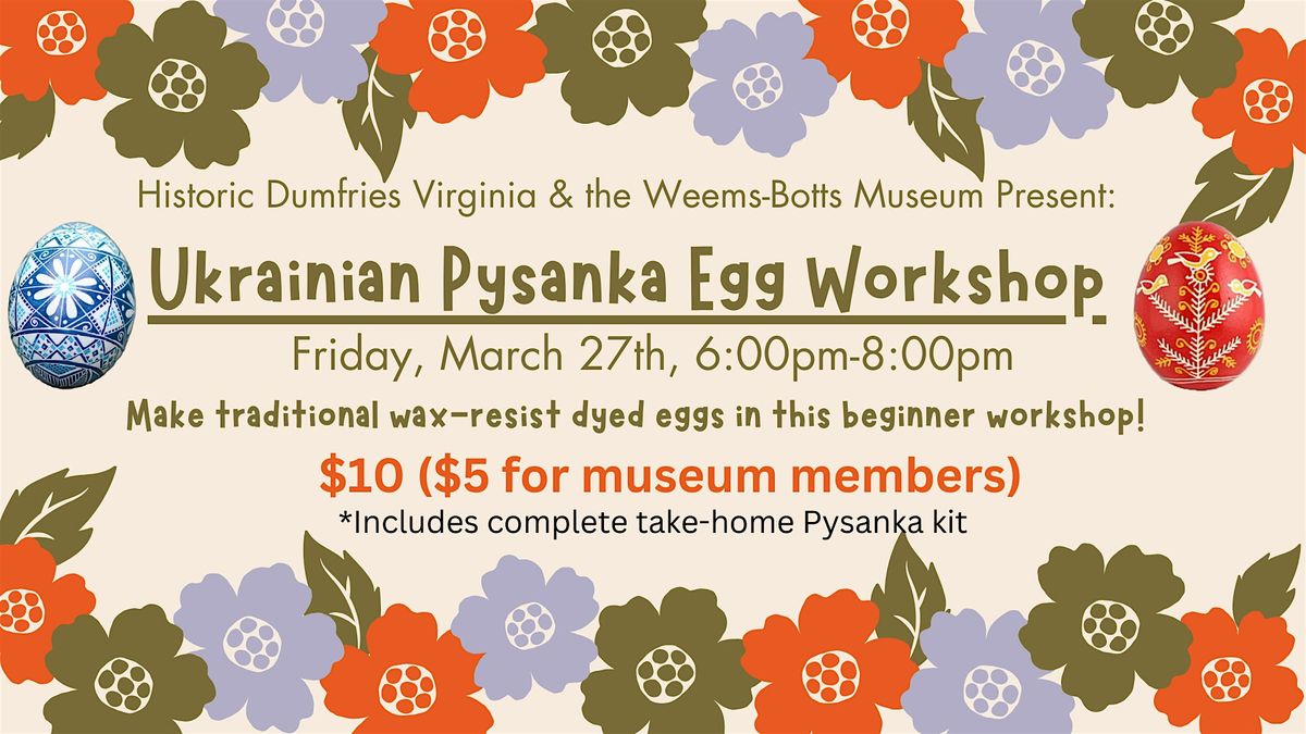 Join us to learn how to make traditional decorative Ukrainian eggs for Easter! All materials will be provided and attendees will receive a complete take-home kit. All proceeds from reservations will go towards Historic Dumfries VA, a nonprofit dedicated to the preservation of the historic Weems-Botts Museum.