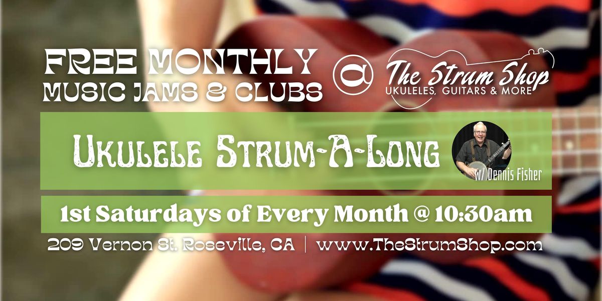 Grab your ukulele and join us for The Strum Shop's 'Free Monthly Ukulele Strum-Along' lead by Dennis Fisher along with Phil and Tina Smith. All skill levels encouraged and welcome. Song leaders will provide playing tips and tricks while we sing fun and familiar songs - golden oldies, classic rock, seasonal and a Hawaiian song or two, are all part of the mix. We share songs (along with chords and words) up on our big screen but you can nestle up to your neighbor and share their music if you don't have your own book (The Daily Ukulele Songbooks - Available for purchase at The Strum Shop). It's cozy and fun!! Bring your uke and your voice and join us for a fun time.