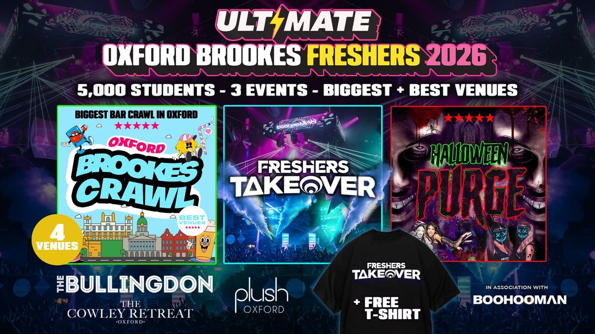 🍹 Student drinks deals👕 Free Freshers Hoodie with every ticket🚨 THE ULTIMATE OXFORD BROOKES FRESHERS LINE UP 🚨🔥ULTIMATE EVENT 1: OXFORD BROOKES BAR CRAWL🗓DATE: SUNDAY 13TH SEPTEMBER📍VENUES: THE BULLINGDON, COWLEY RETREAT, BLACK SWAN, JAMES STREET TAVERNOXFORD BAR CRAWL ENDS IN THE BULLINGDON FOR A ALL NIGHT AFTER PARTY!🔥ULTIMATE EVENT 2: FRESHERS TAKEOVER🗓DATE: WEDNESDAY 16TH SEPTEMBER📍VENUE: PLUSH🔥ULTIMATE EVENT 3: HALLOWEEN PURGE - OXFORDS BIGGEST HALLOWEEN EVENT🗓DATE: COMING SOON📍VENUE: COMING SOON