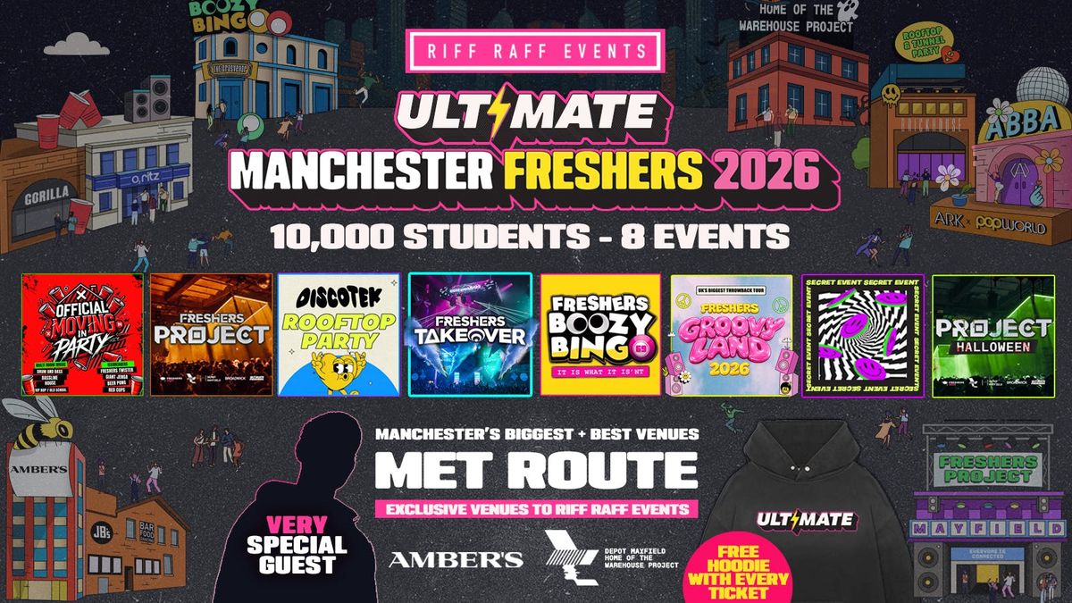 Welcome to the biggest, wildest and most talked about events of your freshers week hosted by Manchester's Biggest + Best student events company Riff Raff Events..SOLD OUT EVERY YEAR SINCE 2008!Over the last 18 years Riff Raff Events have provided the Ultimate freshers week experience for over 600,000 students and now it's your turn. Get ready for the most highly anticipated fresher week events in Manchester’s history.Riff Raff Events has exclusivity to the hottest venues in the city that no other student events company can get access to such as; Mayfield Depot, home of the Warehouse Project and Ambers the best and most talked about venues In the city. Last year we broke the record for the UK’s biggest Halloween event in the whole of the UK at Mayfield Depot with our event Halloween Project.We sell out far in advance every year, so please make sure to buy your ticket early. These events are not your usual student night events, except internationally loved DJs, high end festival production, sound breaking bass and the friendliest students! You will remember this freshers week for the rest of your life. We offer something everyone can enjoy, we work hard to make our events the most inclusive there is. Big parties and drinking might not be your thing but Riff Raff is all about making friends and being the standout night as you adjust to university life.Whether you're looking to make new friends, party hard, or experience the best nightlife your new city has to offer, these are THE events you don’t want to miss. This Wristband sells out before University starts, so buy your fully refundable ticket early to avoid disappointment and save £££.🚨 THE ULTIMATE MANCHESTER FRESHERS LINE UP 🚨🏠ULTIMATE EVENT 1: OFFICIAL MOVING IN PARTY🗓DATE: SUNDAY 20TH SEPTEMBER📍VENUE: O2 RITZ🚨ULTIMATE EVENT 2: THE FRESHERS PROJECT🗓DATE: MONDAY 21ST SEPTEMBER📍VENUE: DEPOT MAYFIELD - HOME OF THE WAREHOUSE PROJECTTHE ONLY FRESHERS EVENT TO BE HELD AT MAYFIELD DEPOT THE HOME OF THE WAREHOUSE PROJECT!🔥ULTIMATE EVENT 3: FRESHERS BOOZY BINGO🗓DATE: TUESDAY 22ND SEPTEMBER📍VENUE: THE GROSVENOR✅ MUST ADD ON🔞ULTIMATE EVENT 4: ROOFTOP PARTY + HOUSE PARTY🗓DATE: TUESDAY 22ND SEPTEMBER📍VENUE: BRICKHOUSE ROOFTOP + KABLE CLUB - FULL 3 FLOOR TAKEOVER🤫ULTIMATE EVENT 5: TWO CLUB TAKEOVER🗓DATE: WEDNESDAY 23RD SEPTEMBER📍VENUE: AMBERS + GORILLA ✨ULTIMATE EVENT6: GROOVY LAND - THE ULTIMATE THROWBACK EVENT🗓DATE: THURSDAY 24TH SEPTEMBER📍VENUE: ARK + POPWORLD🤫ULTIMATE EVENT 7: SECRET EVENT🗓DATE: FRIDAY 25TH SEPTEMBER📍VENUE: COMING SOON