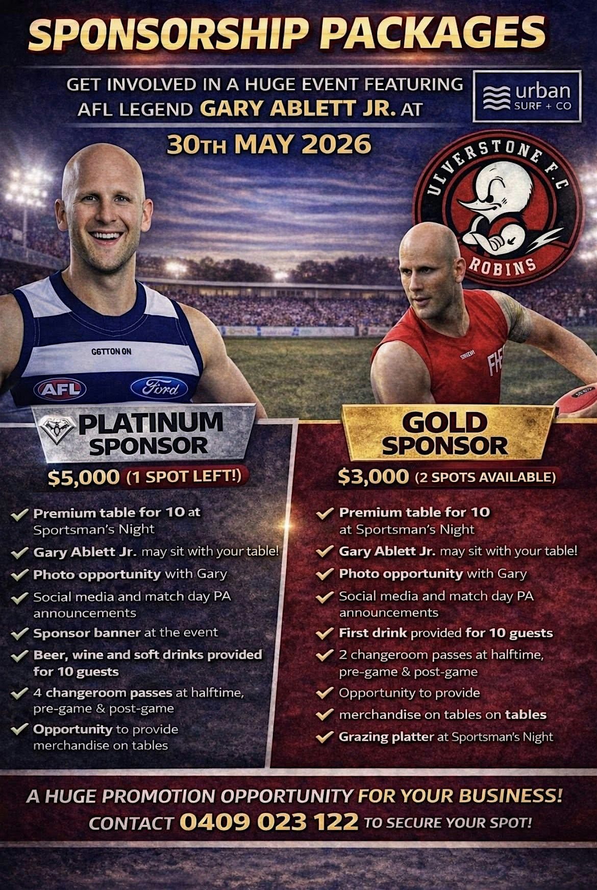 Join us in person for an unforgettable evening with Gary Ablett Jr at the Ulverstone Football Club! It's a fantastic chance to hear from one of footy's greatest players of all time! Don't miss out on this awesome event – come along and be part of the action!