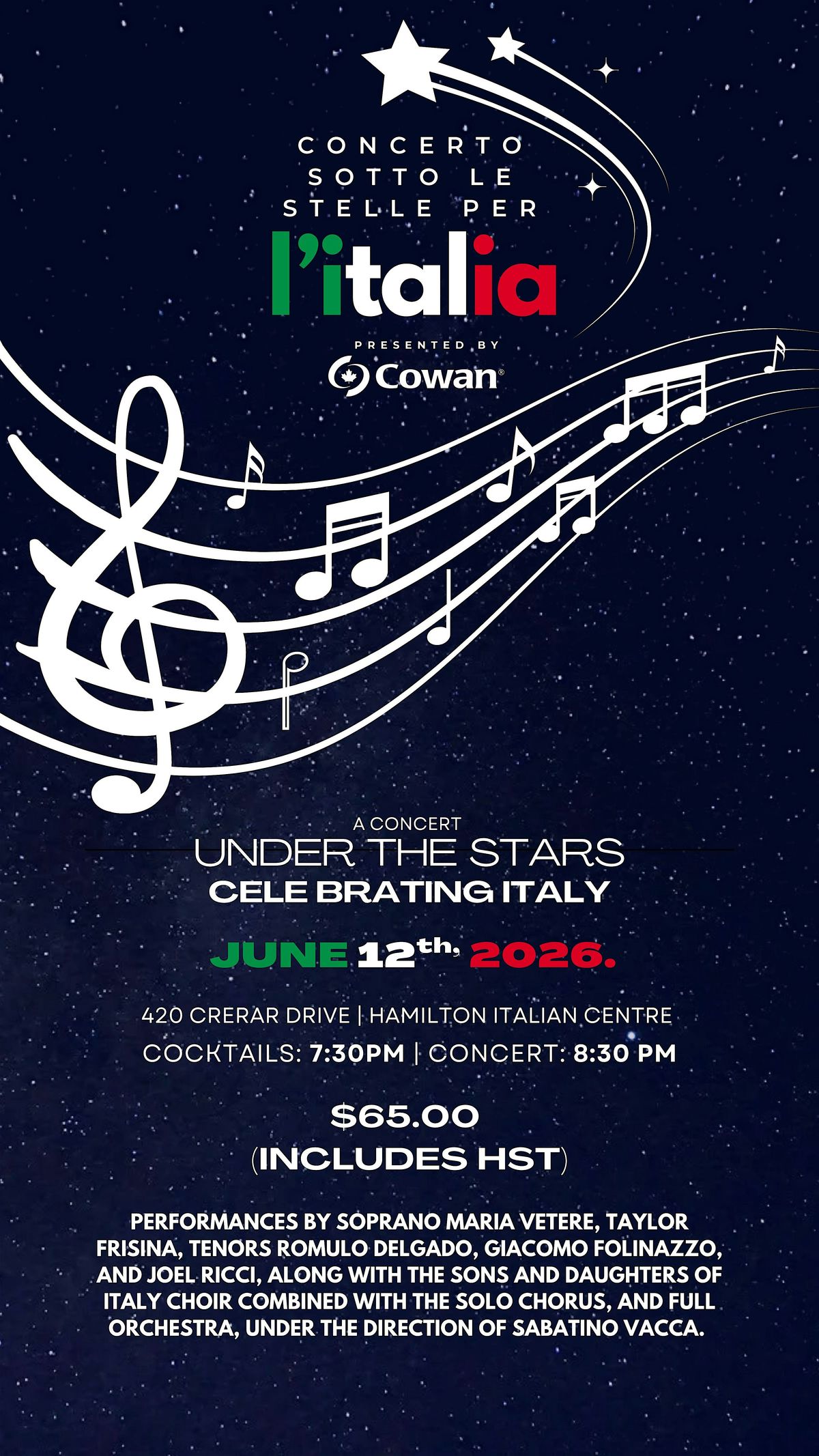 It will take place outdoors under the stars at the Hamilton Italian Centre, 420 Crerar Drive in Hamilton.
