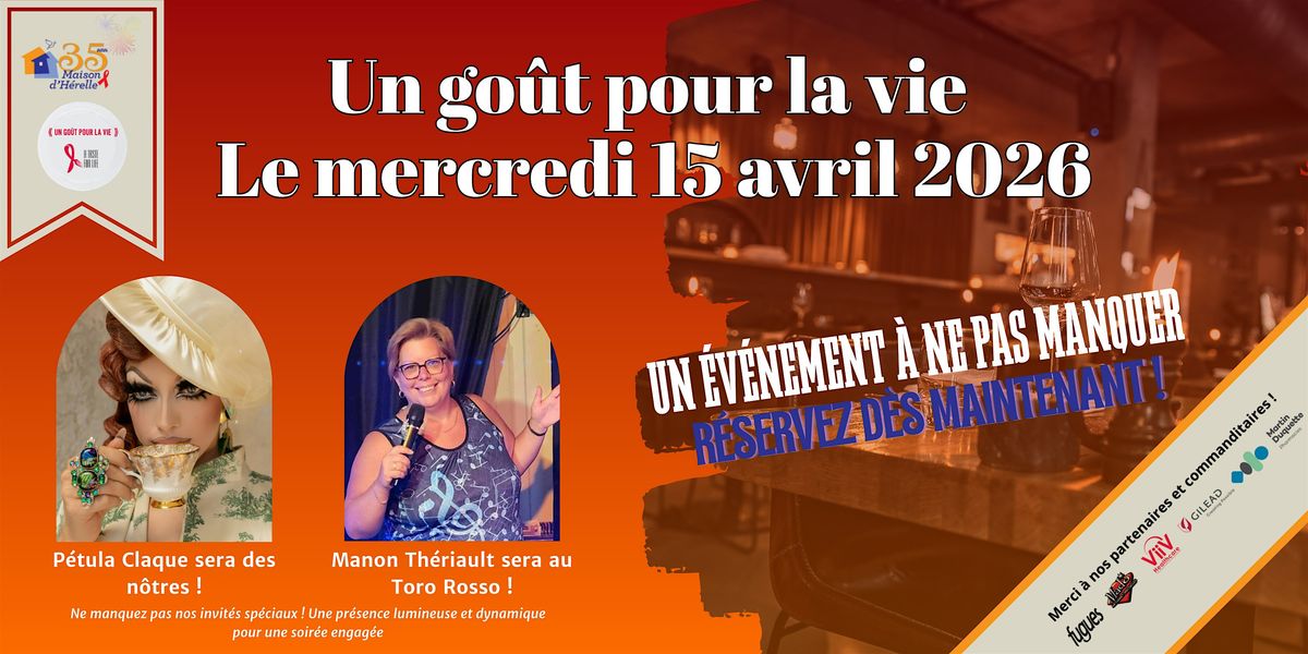 Depuis 1999, à travers le Canada, A Taste For Life récolte des fonds pour les hommes et les femmes vivant avec le VIH/sida. Il s’agit d’un événement qui invite certains restaurants, dans chacune des villes participantes, à verser 25 % de leurs ventes à l’organisme communautaire local qui organise l’événement dans sa région. Pour une 7e année, la Maison d’Hérelle est fière de joindre les rangs du regroupement pancanadien pour tenir l’événement « Un goût pour la vie » /A Taste For Life à Montréal et ses environs.