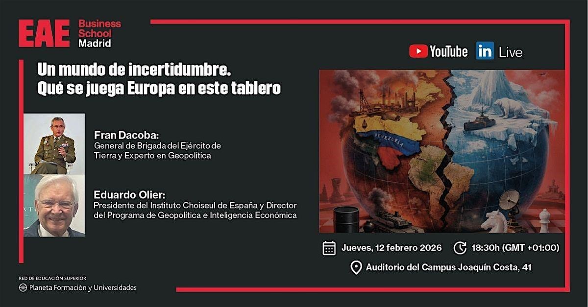 La sesión contará con la participación de Fran Dacoba, General de Brigada del Ejército de Tierra y experto en Geopolítica; Eduardo Olier, Presidente del Instituto Choiseul de España y Director del Programa de Geopolítica e Inteligencia Económica; y Manuel Fernández-Villacañas, Secretario académico del Programa de Geopolítica e Inteligencia Económica.