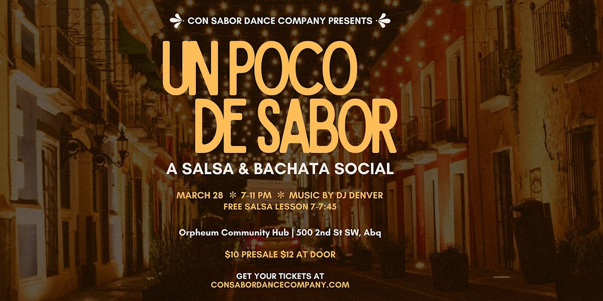 Entry is $12 at the door (cash or venmo). Presale price is $10 at https://www.consabordancecompany.com/upcoming-classes-and-events/p/un-poco-de-sabor-salsa-bachata-social