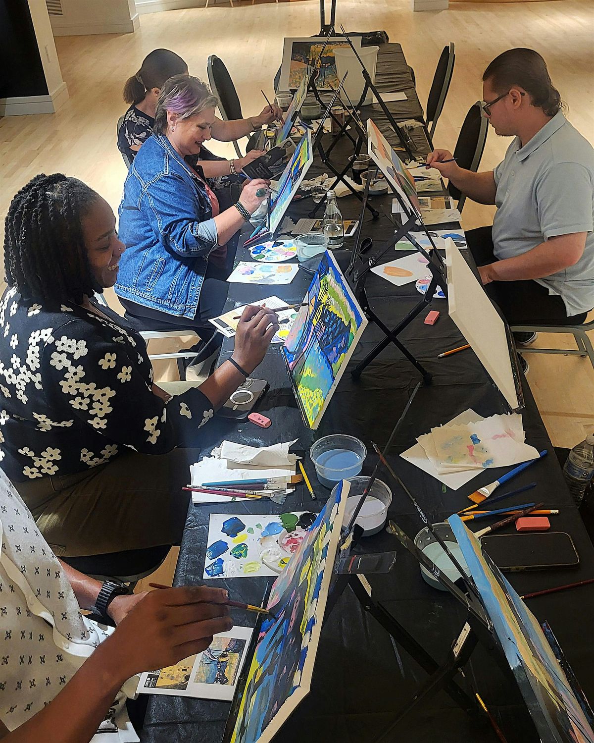 Dive into a world of creativity! Our instructors will lead you in guided experience to create and keep a 11×14” canvas painting based on selected work by a Master painter in a fun and easy-to-follow format. Learn about art history and contemporary art while you socialize and sip! We provide supplies and a selection of beverages. Your first drink is on us!