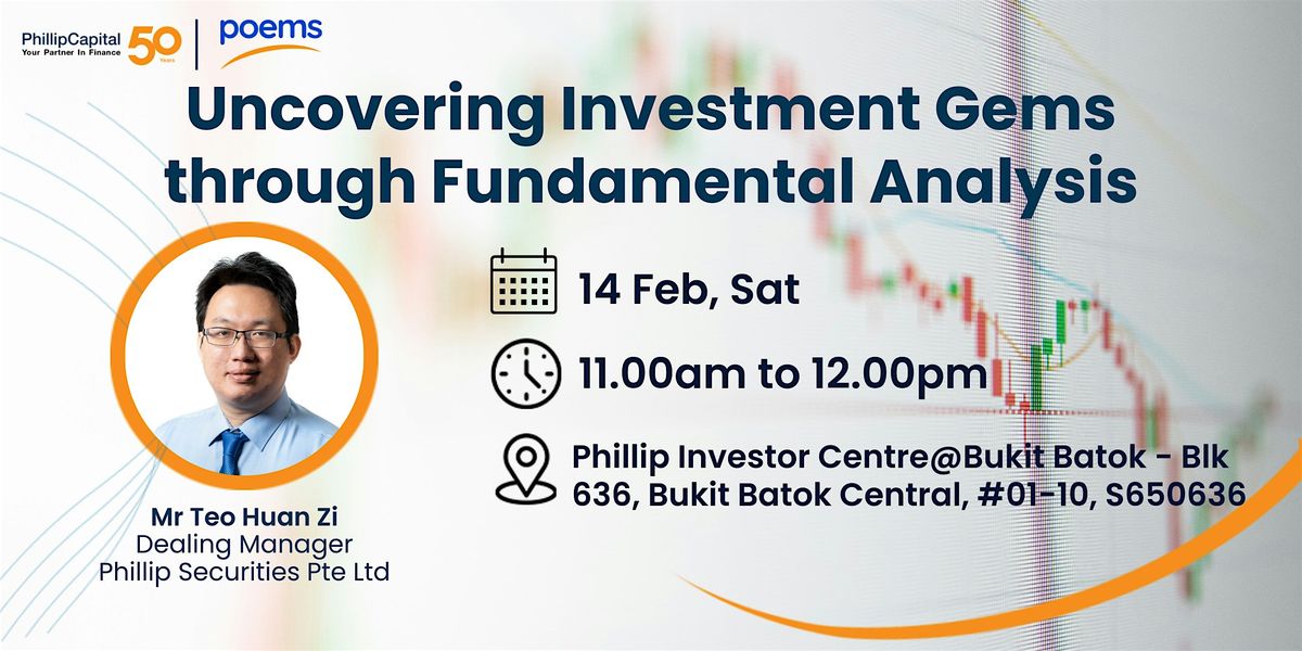 Join us at this seminar on 14 Feb, Sat at 11.00am, where Mr. Teo Huan Zi, Dealing Manager at Phillip Securities, will delve into the art of fundamental analysis. You'll learn how to dig deep into a company's financials, management, and industry to uncover its true value. Discover the power of financial ratios, earnings reports, and economic indicators to support more informed investment decisions.