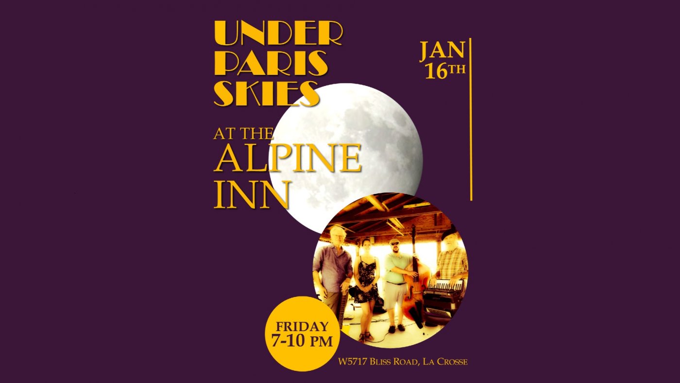 The music of UNDER PARIS SKIES is bound to captivate you with their blend of gypsy jazz, vintage swing and Latin influences. Their repertoire is inspired by vintage American jazz clubs, French cabarets, Argentine dance halls and Mediterranean cafes. Sophisticated arrangements and sentimental melodies carry you to faraway and familiar places—no passport required, just good vibes. Don't miss this great evening of live music!
