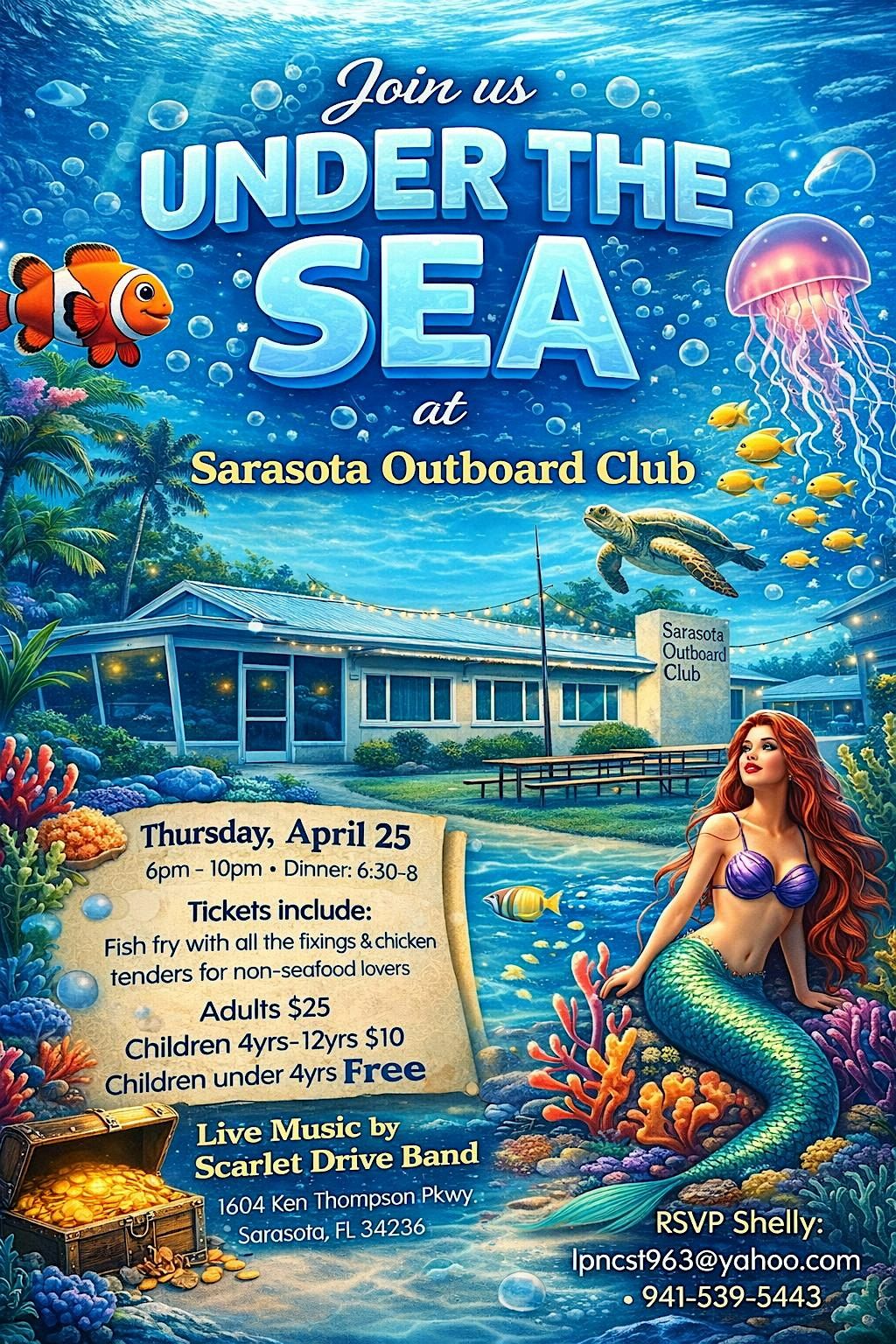 Join us for a magical βUnder the Seaβ themed party at Sarasota Outboard Club β where ocean vibes, great food, and live music come together for an unforgettable night!