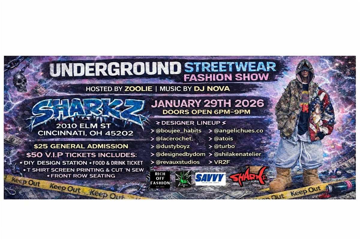 Hosted by @zoolibaby with music by @fka.nova, the night brings together emerging designers, live performances, interactive activations, and raw fashion energy at Sharkz Night Club in downtown Cincinnati.