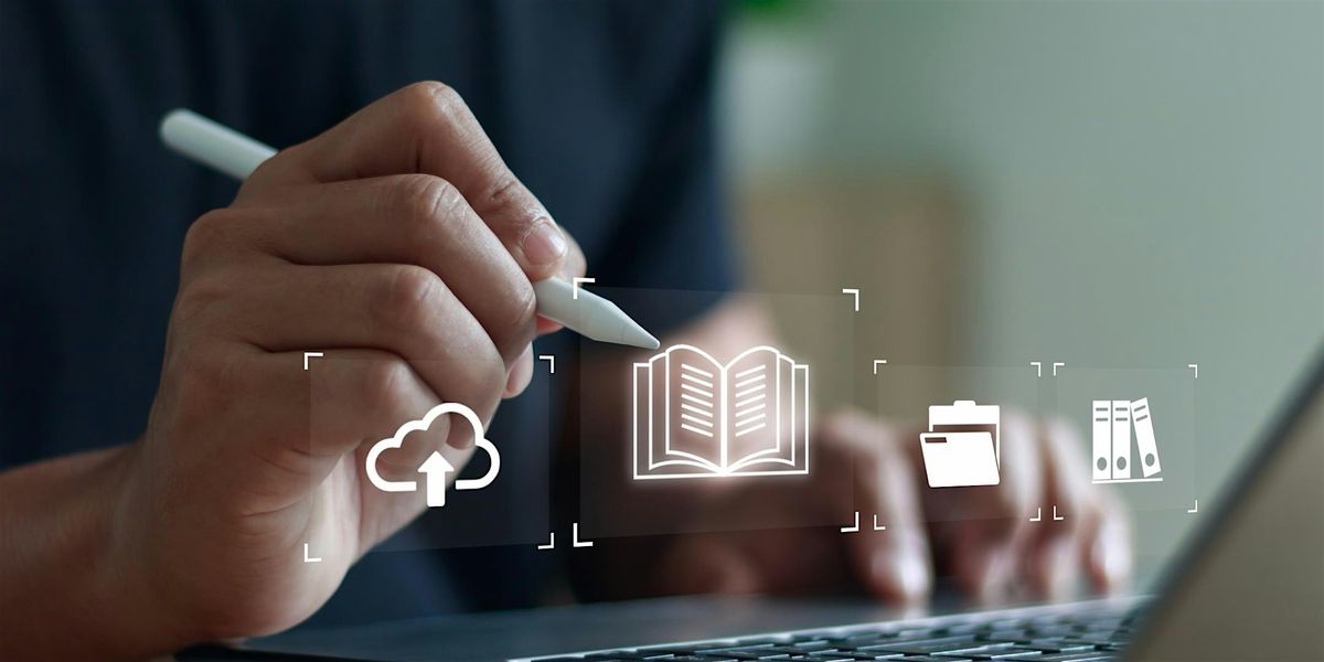 Image: A hand poised over a laptop holds a stylus pointed at floating images (a book, Cloud, folder and files).