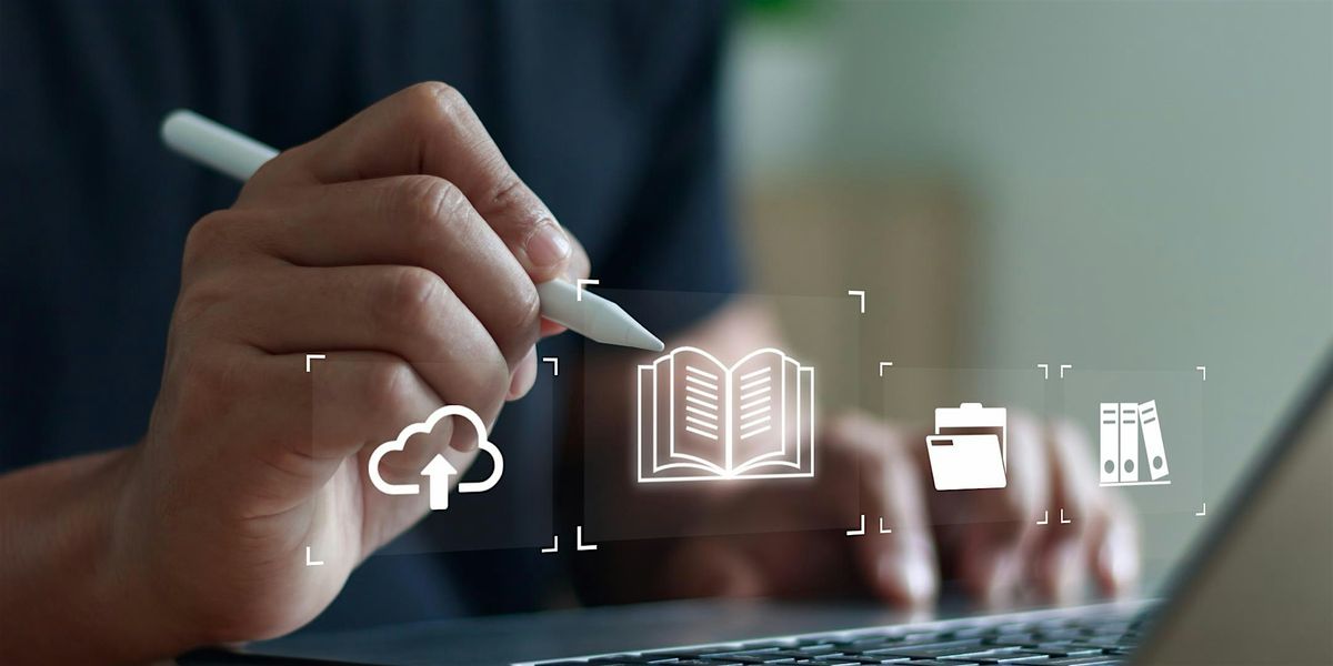 Image: Close-up of a hand holding a stylus over a device. Transparent boxes containing a cloud, book, folder and file symbol hover over the keyboard.