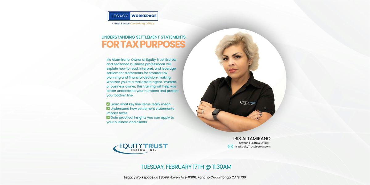 Join us for an insightful Legacy Workspace training on Tuesday, February 17th at 11:30 AM at our Rancho Cucamonga office, where weβll break down one of the most important yet misunderstood documents in real estate and taxesβthe settlement statement.