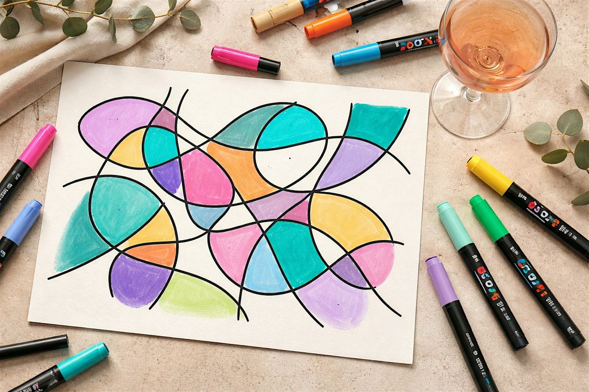 With music playing and a cocktail or glass of bubbles in hand, we’ll spend time filling in our abstract shapes and reflecting on what we see. Not in a therapy way. In a curious, low-pressure way.
