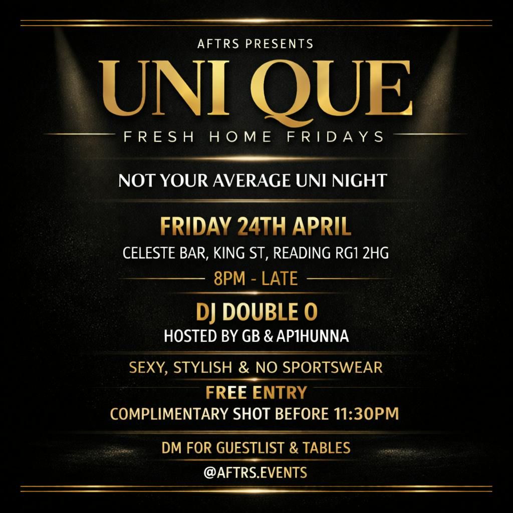 Friday 24th Of April, SAVE THE DATE‼️@aftrs.events presents UNI QUE 🥳@djdoubleo_ will be performing plus a variety of other talented local DJs - hosted by @ap1hunna_ and @333gabeAt our favourite venue in Reading Celeste Bar and Shisha Reading - Free entry all night ✅- get down before 11:30pm to grab your complimentary shot🥳1 dDisclaimer: