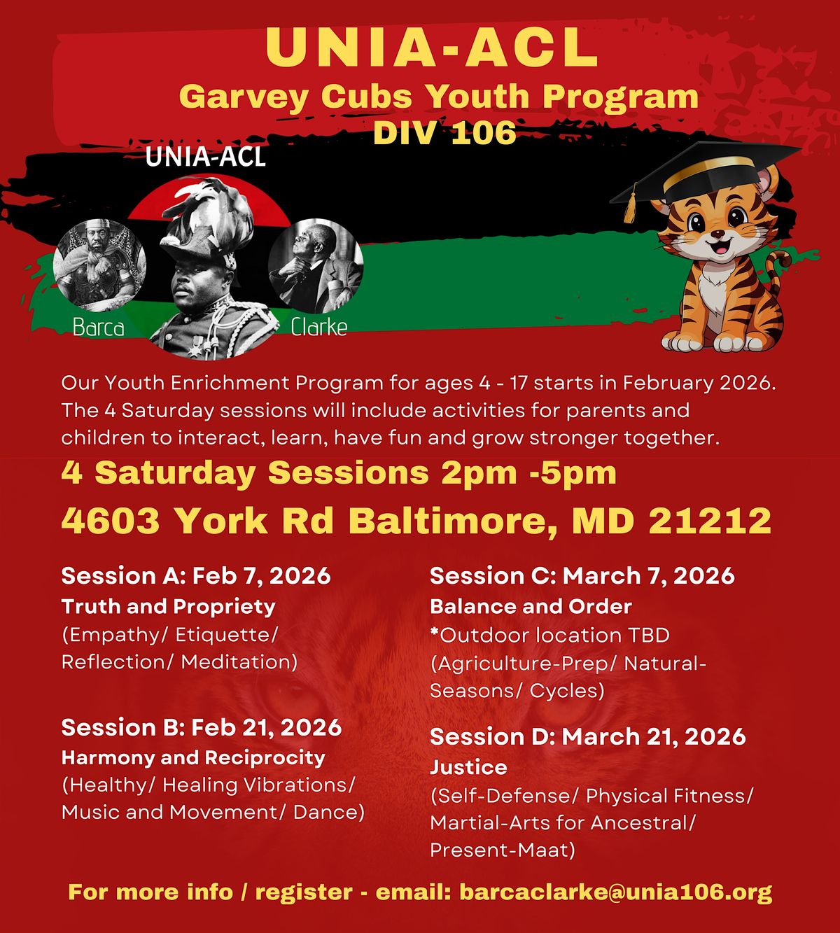 Baltimore UNIA-ACL Garvey Cubs Youth Program Join the Baltimore UNIA-ACL as we proudly relaunch our Youth Department, inspired by the powerful legacy of Marcus Garvey—where no generation was left behind! Families are invited to participate in a four-session Garvey-inspired pilot program designed to educate, empower, and uplift our youth.