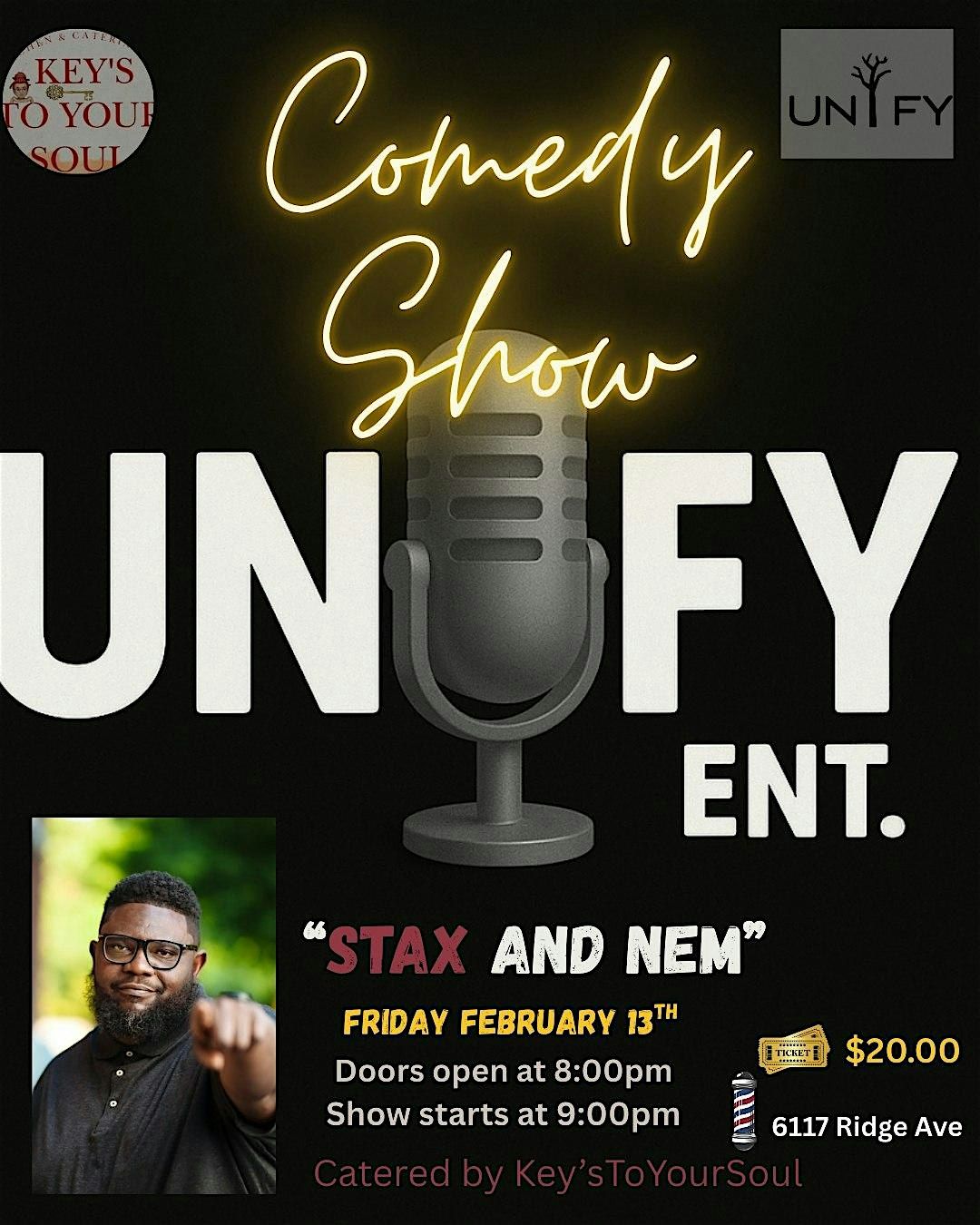 A night of laughs, hosted by UNIFY ENT featuring “Stax and Nem.”Doors at 8PM • Show at 9PM • Food catered by Key’s To Your Soul