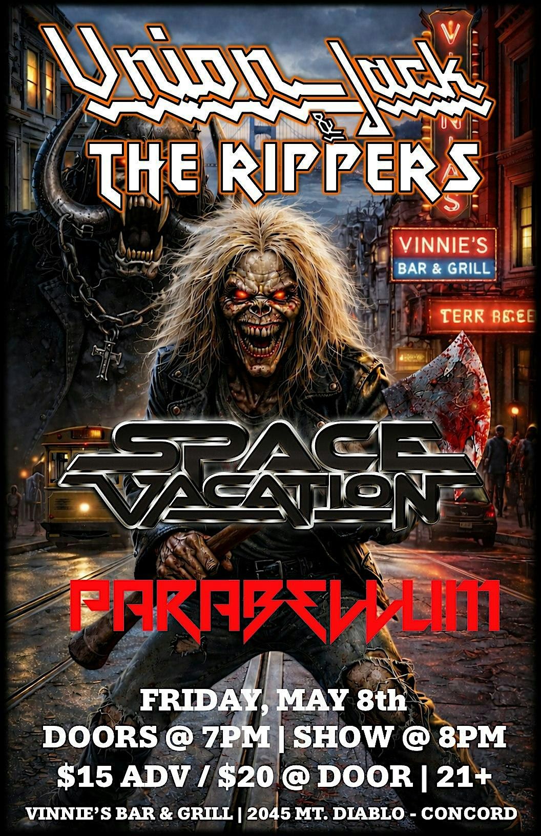 Union Jack & The Rippers return to Vinnie's with a headlining set of 70s/80s metal classics! Parabellum & Space Vacation round out the night