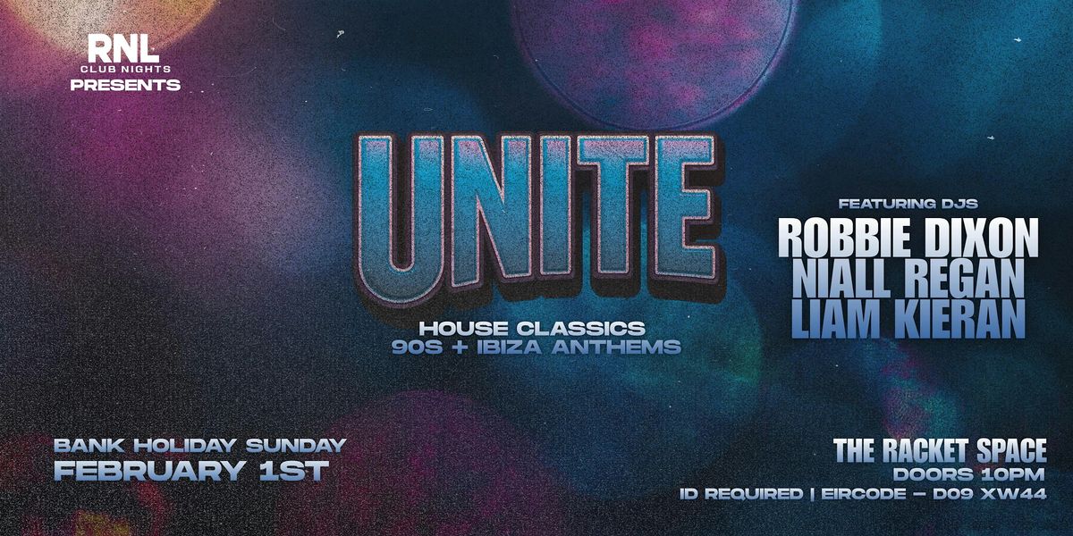 RNL Clubnights are back in the Racket Space Bank Holiday Sunday , February 1st with ‘Unite’ A night of House Classics , 90s & Ibiza AnthemsAbout this Event