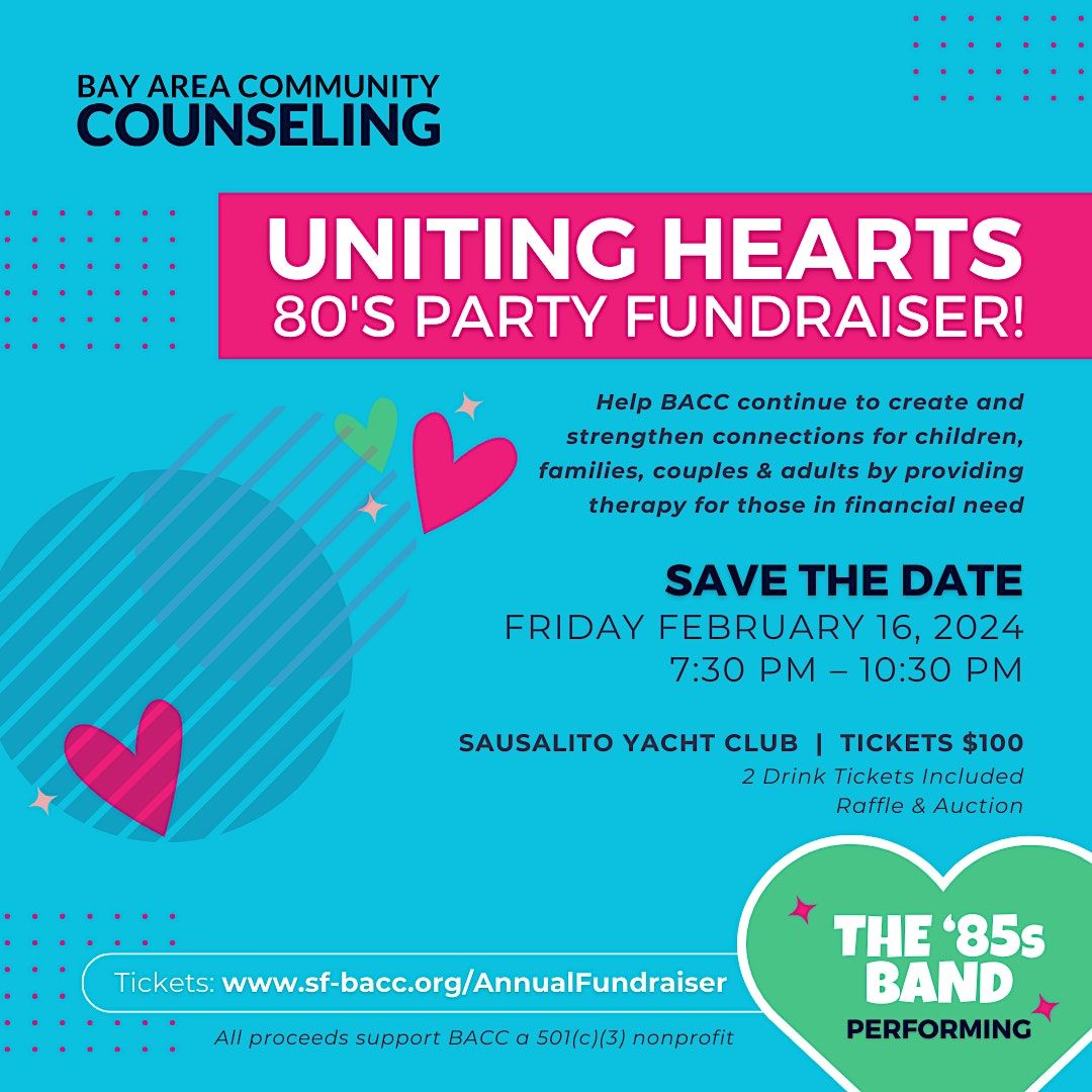 Come join us on Friday, February 16th at Presidio Yacht Club to dance the night away! Bring your friends, family, partner, coworker, or anyone you’d like for a fun evening of 80’s music by the band The 85’s. We’ll be celebrating and fundraising for a great cause, mental health services for those in financial need.