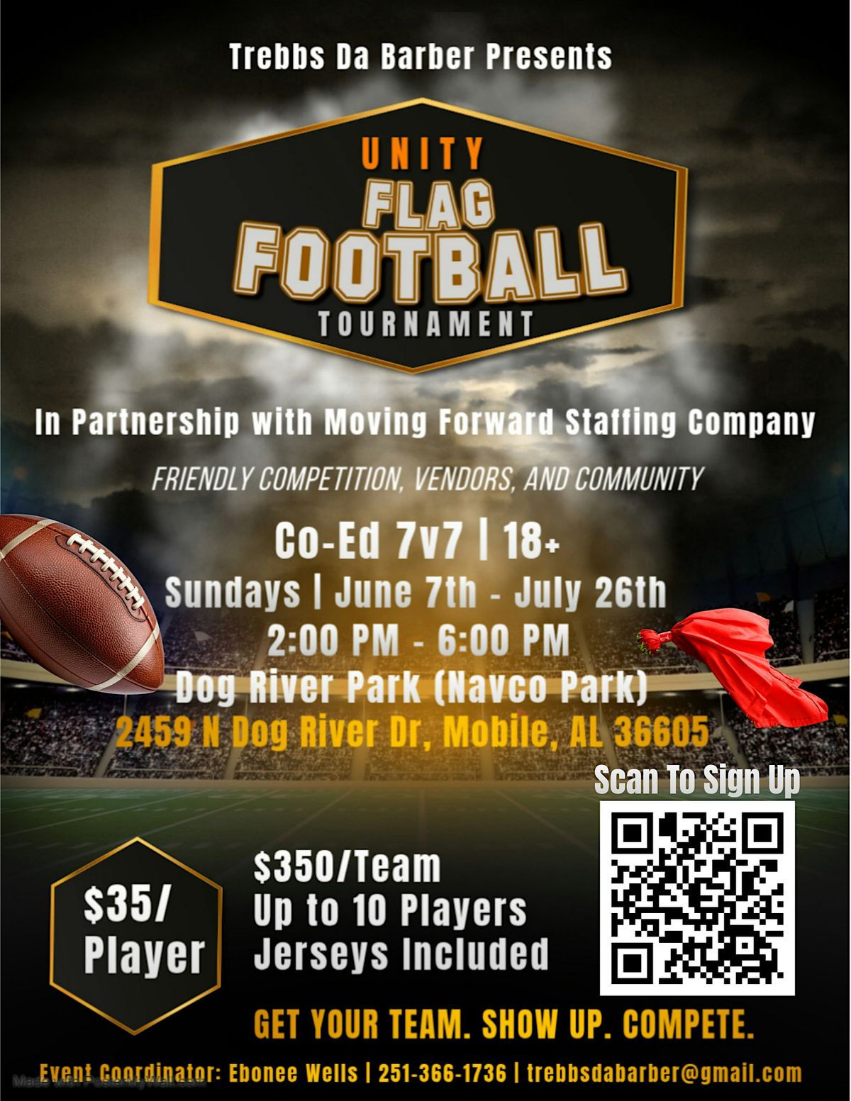 Unity Flag Football Summer ’26 is a co-ed adult 7v7 flag football league bringing competition, energy, and community engagement to Mobile, AL. This eight-week Sunday series combines competitive play with local vendors, music, and a family-friendly atmosphere at Dog River Park. Designed to create connection both on and off the field, Unity Flag Football is more than just a league — it’s a platform for local businesses, entrepreneurs, and the community to come together. Whether you're forming a team, vending, sponsoring, or just pulling up to support, this summer we’re building something intentional, competitive, and unforgettable.