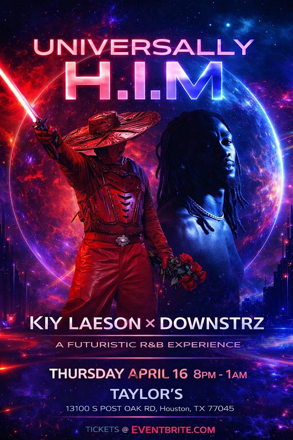 Universally H.I.M: Kiy Laeson x Downstrz ignite Houston with a futuristic, sensual R&B experience. April 16, 8PM–1AM @ Taylor’s. Don’t miss