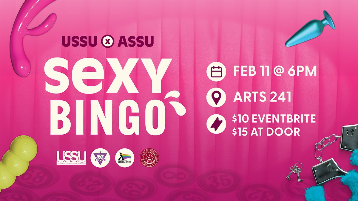 Join the Arts & Science Students' Union and USSU Pride and Women's Centres in Arts 241 for the fifth annual Sexy Bingo Night, a bingo event promoting sexual wellness and positivity. Proceeds go to Saskatoon Sexual Health!