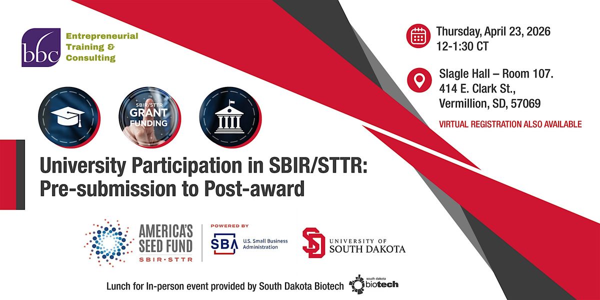 South Dakota Biotech is sponsoring a light lunch for in-person attendees in Sioux Falls, Rapid City, Aberdeen, Brookings, and Vermillion. This is a great opportunity for SD innovators to get together and network while learning more about the SBIR/STTR program.