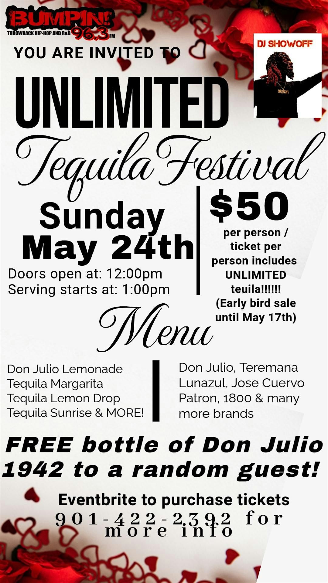 UNLIMITED TEQUILA FESTIVAL! Servings per guests are unlimited but regulated by Alcohol Beverage Control state of Tennessee! $50 per guest!