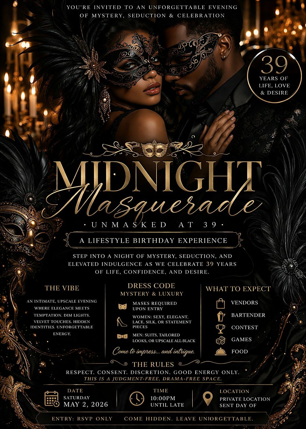 Step into a night of mystery, seduction, and elevated indulgence as we celebrate 39 years of life, confidence, and desire.