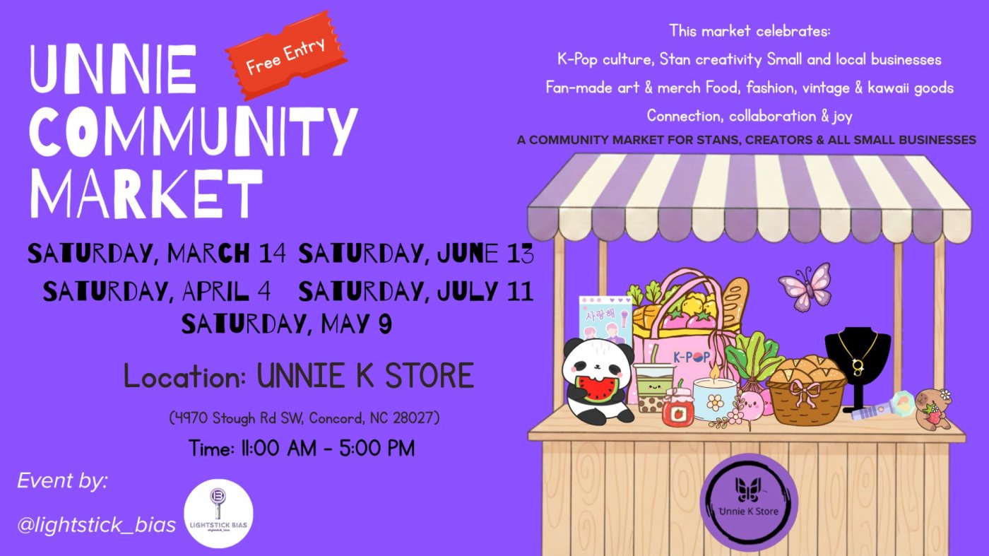 Unnie’s Community Market is a rotating community market hosted at Unnie K Store, created as a safe, inclusive space where K-Pop Stans, artists, food vendors, vintage sellers, kawaii creators, and small businesses can all come together. There are no fandom limits here. No genre boxes. No “you don’t fit the vibe.”