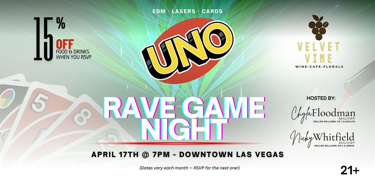 Weโre taking over Velvet Vine Wine, a downtown wine bar, and turning it into a rave-style game night. Weโll be playing UNO family-style to keep things social, fast-moving, and fun โ whether youโre a competitive menace or just here for the vibes.