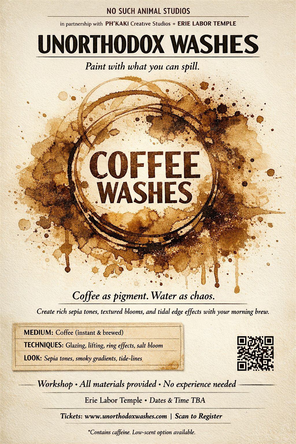 UNORTHODOX WASHES — Session I: Coffee Washes is the opening night of a five-part series where we trade traditional paint for beautifully unpredictable natural media. In this session, your “palette” is coffee—brewed, instant, and concentrated—turned into a rich range of sepia tones that bloom, stain, and drift across the page in ways watercolor can only imitate.