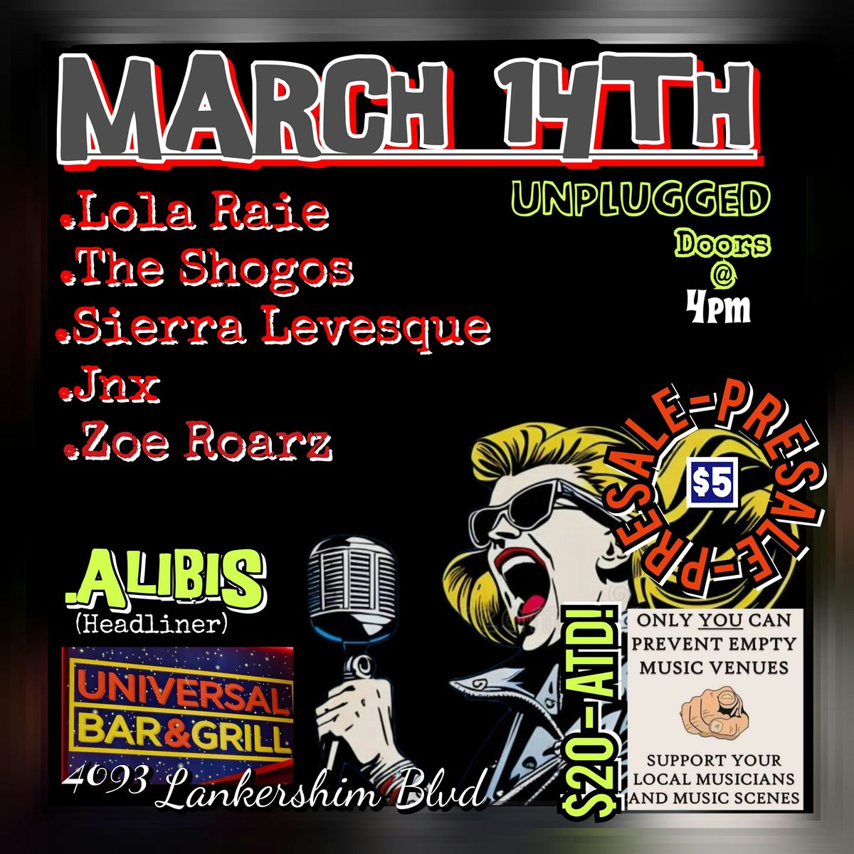 Come check out Lola Raie, The Shogos, Sierra Levesque, JNX, Zoe Roarz and the Alibis at The famous Universal Bar and Grill ! $20 At the doorAbout this Event