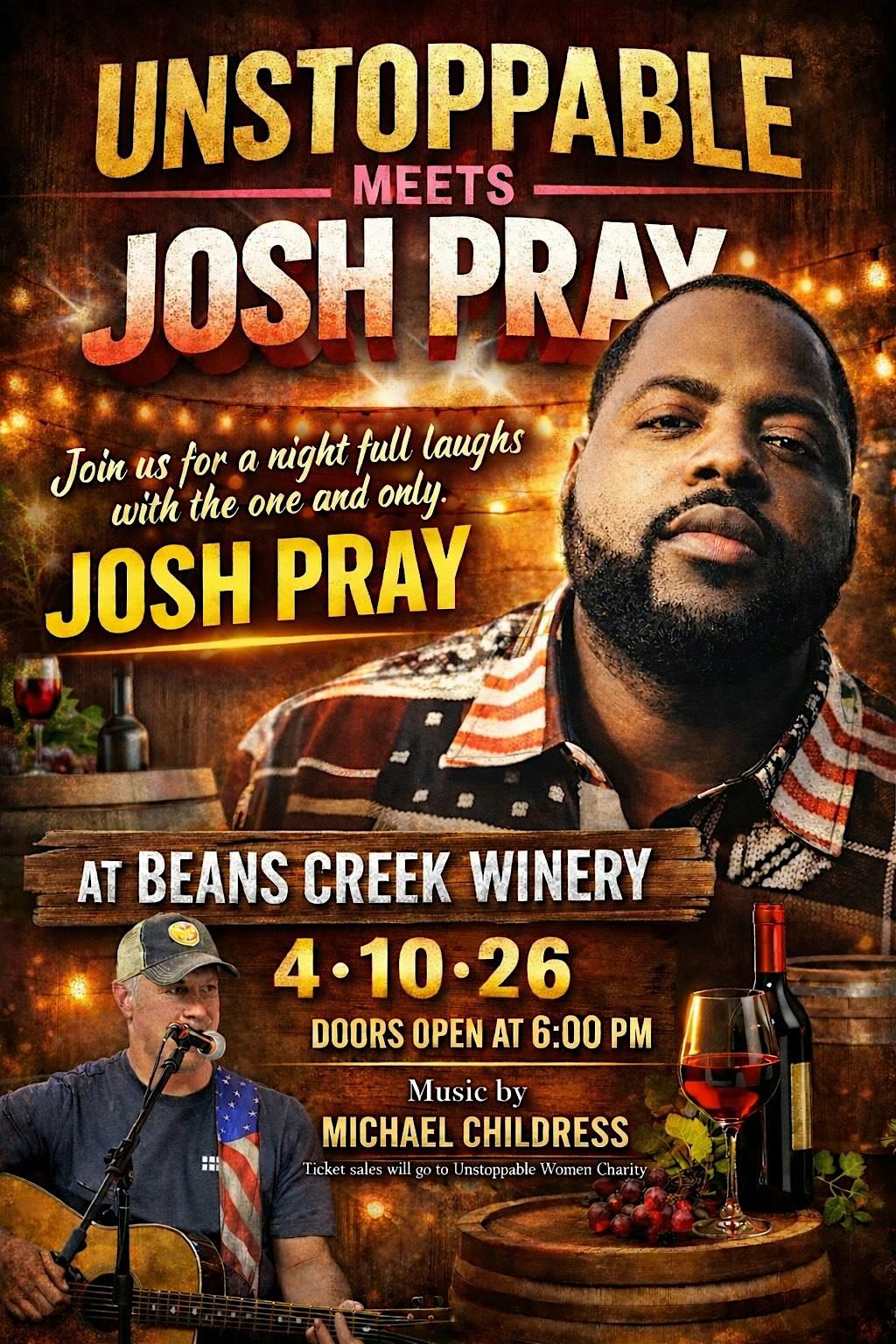 Join us for an unforgettable evening at Beans Creek Winery as Unstoppable Women proudly presents Unstoppable Meets Comedian Josh Pray—a night filled with laughter, live music, and purpose.