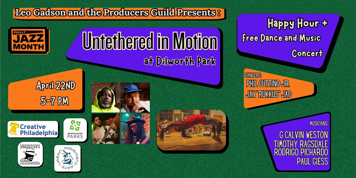 Leo Gadson's Producer's Guild presents, Untethered in Motion at Dilworth Park. Featuring members of the performing ensemble Untethered, in collaboration with dancers curated by Urban Movement Arts in concert at Dilworth Park's Happy Hour. With Grant Calvin Weston at the drums, the group engages in what he dubs "Spontaneous Collective Composition". An exciting, energetic interplay between musicians, dancers and the audience that draws on jazz music's early connections to dance, while looking to the future for new sounds and expressions.