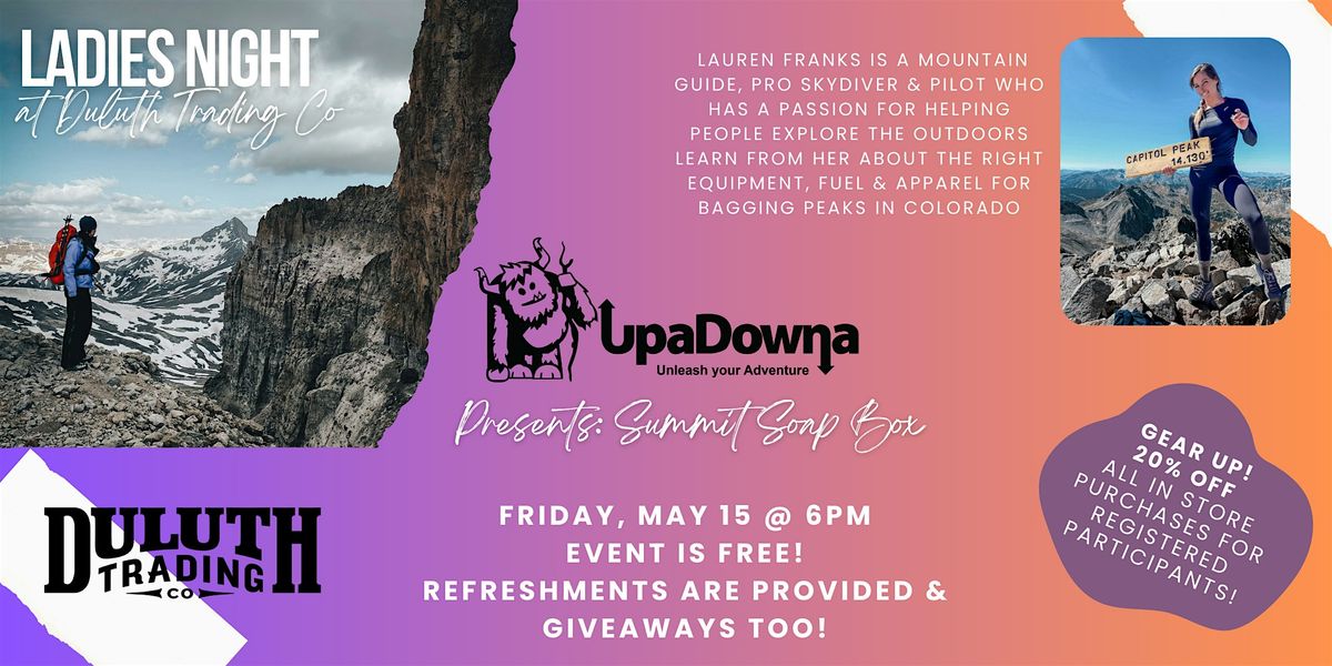 Event Details: Summit Soapbox is part of UpaDowna's Community Campfire Program. Join us for snacks, shopping and inspiration. Our speaker will be sharing information & resources to inspire & prepare you to pursue adventure! UpaDowna will provide refreshments & some fun giveaways as well!
