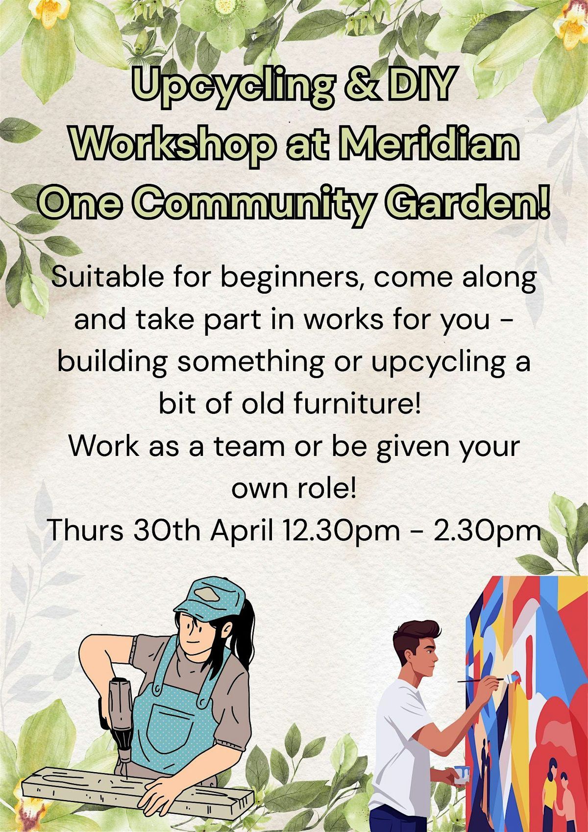 Come and learn some DIY upcycling skills and help us to develop furniture for our community garden! Upcycle plant pots to take home!