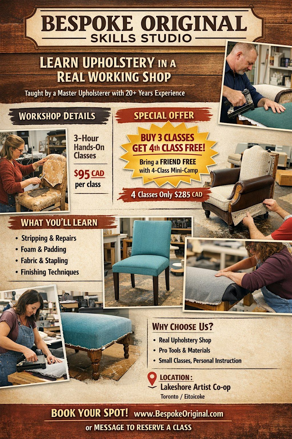 **Upholstery Classes – Toronto / Etobicoke**Want to learn **real upholstery skills in a working studio**?At **Bespoke Original Skills Studio**, you can bring your own project and learn step-by-step how to repair, rebuild, and reupholster furniture with guidance from a **Master Upholsterer with 20+ years experience**.---**CLASS DETAILS**• 3-hour hands-on workshop