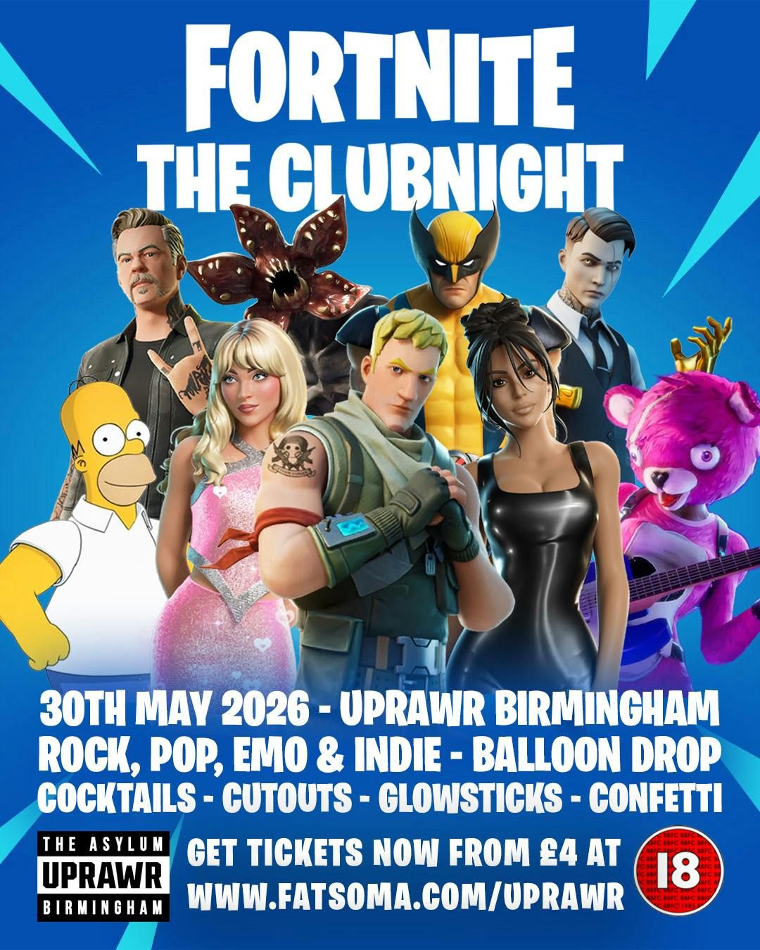 UPRAWR: FORTNITE CLUBNIGHT!Over the years we've done Minecraft night, Five Nights at Freddy's night, Guitar Hero night, Sims night, Mario night...it was only a matter of time until Fortnite got the UPRAWR treatment!WHAT TO EXPECT- Fortnite stage and venue decoration- Fortnite cardboard cut outs- Fortnite gameplay on screens- Fortnite themed cocktails- Fortnite tunes (From Fortnite Festival and musicians who appear in Fortnite!)- The biggest alternative, indie, rock, and pop anthems- Glowsticks- Confetti Cannons- Balloon Drop- Photo Booth- Photo Ops- Official Photographer- 4 bars split between 2 rooms and a massive outdoor courtyard- Private VIP Podiums for hire - contact [email protected] for more information on these!MUSIC POLICY Expect to hear...Metallica - Sabrina Carpenter - Gorillaz - Billie Eilish - Lady Gaga - My Chemical Romance - Paramore - Panic! at the Disco - Green Day - Twenty One Pilots - The Weeknd - White Stripes - All American Rejects - Queens of the Stone Age - Blink-182 - Weezer - Charli XCX - Limp Bizkit - Olivia Rodrigo - Nine Inch Nails - Linkin Park - P!NK - Muse - Foo Fighters - PinkPantheress - No Doubt - Nirvana - Eminem - Rob Zombie - Post Malone - Red Hot Chili Peppers - The Killers - Artemas - LISA - Pierce the Veil - Julia Wolf and MORE! Get tickets now from £4! See you there Birmingham's Only Alternative Nightclub - UPRAWR - FORTNITE - EMO ALTERNATIVE ROCK AND INDIE CLUB BIRMINGHAM