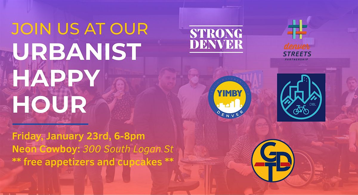 Members of YIMBY Denver, Greater Denver Transit, Strong Denver, Denver Streets Partnership, and Denver Bicycle Lobby are coming together to host quarterly happy hours to connect, collaborate, and celebrate the work we’re all doing to make our city better.