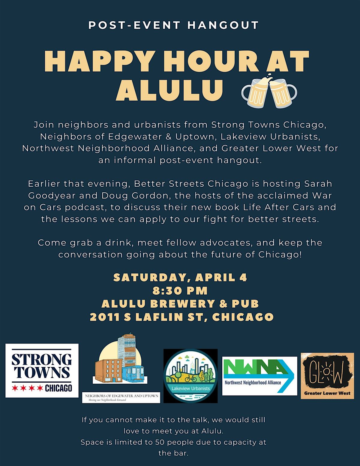 Come grab a drink at Alulu Brewery & Pub, meet fellow advocates, and keep the conversation going about the future of our cities.