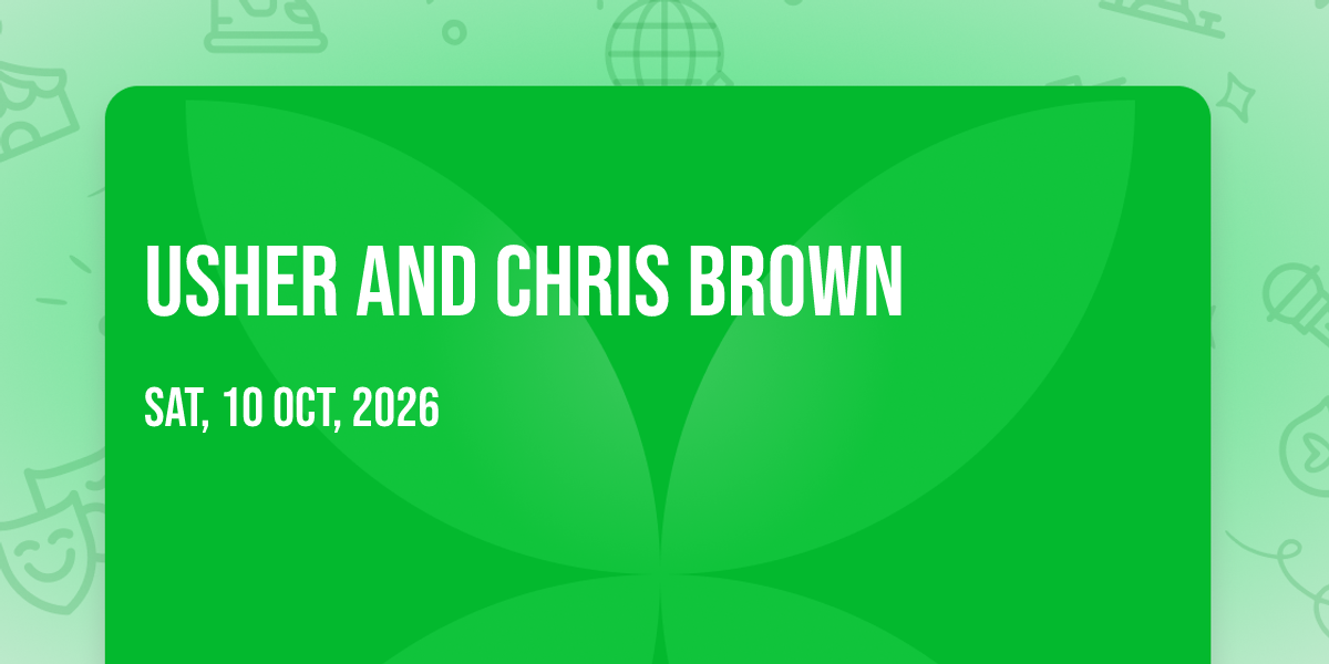 📍 Location: 29.6849, -95.4107🌟 Be part of history at Usher and Chris Brown, an extraordinary gathering that will captivate your imagination! 🏛️ The prestigious NRG Stadium in Houston, TX sets the stage for an unforgettable experience on October 11th, 2026 at 12:00 AM. ✨ They are bringing together the finest elements of entertainment and innovation to create moments that will take your breath away. From the moment you arrive, you'll be immersed in an atmosphere of wonder and excitement. 🎯 This carefully planned event ensures every guest experiences something truly special. 🎊 Early booking is recommended for this must-attend event of the season!