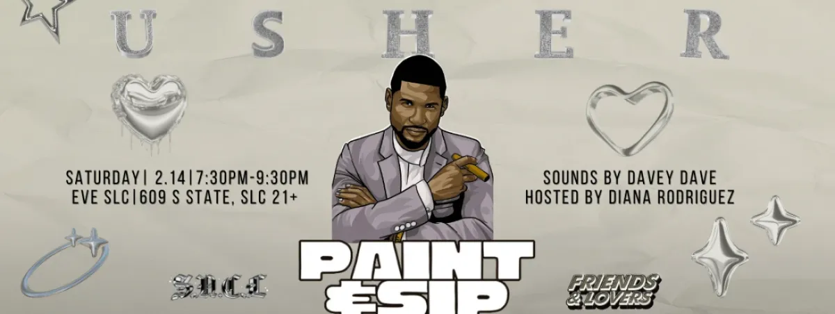 🎨✨ Usher Paint & Sip – Friends & Lovers Edition ✨🎨Join us for a smooth, sexy, and soulful night inspired by Usher’s greatest hits. Whether you’re coming with your partner, your crew, or your besties, this is the perfect night to paint, sip, and vibe.🗓️ Saturday | 2.14 | 7:30PM–10:30PM📍 Eve SLC | 609 S State St, SLC🔞 21+ Event🎧 Sounds by: Davey Dave🎤 Hosted by: Diana RodriguezYour ticket includes all paint supplies and a canvas to take home. Paint along to classic Usher, R&B favorites, and love-themed vibes while enjoying cocktails and good energy.Perfect for couples, friends, and anyone celebrating Valentine’s weekend.💫 Paint. Sip. Connect.⚠️ All sales are final. No refunds.