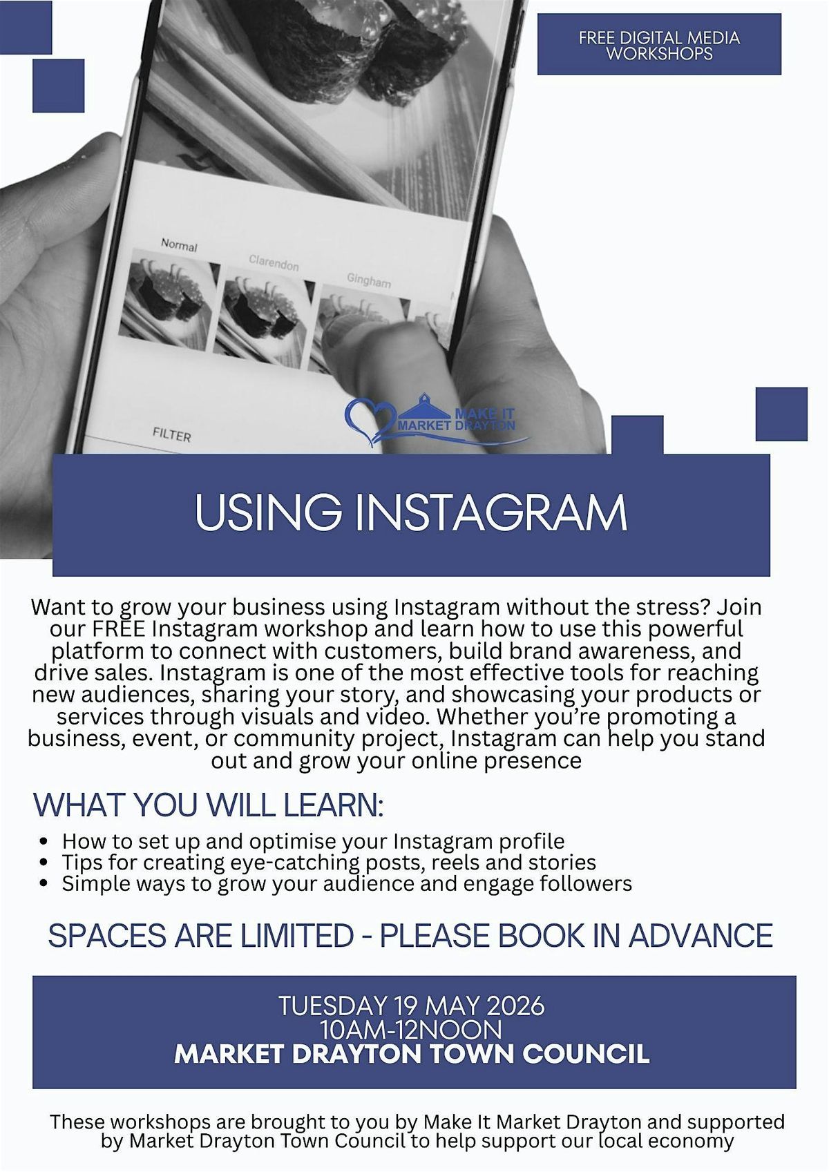 Want to grow your business using Instagram without the stress? Join our FREE Instagram workshop and learn how to use this powerful platform to connect with customers, build brand awareness, and drive sales. Instagram is one of the most effective tools for reaching new audiences, sharing your story, and showcasing your products or services through visuals and video. Whether you’re promoting a business, event, or community project, Instagram can help you stand out and grow your online presence.