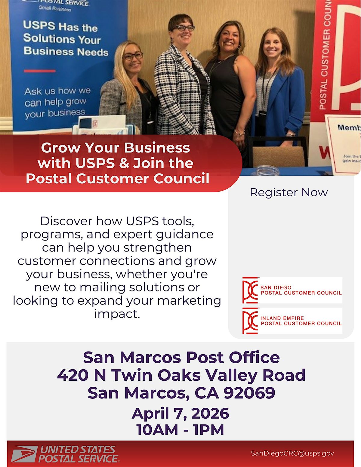 Join us in San Marcos for USPS Grow Your Business Day and the PCC Membership Drive, an event designed to help businesses strengthen their marketing reach and customer connections. Attendees will learn how to leverage USPS tools, mailing solutions, and promotional programs to support growth and improve efficiency. USPS specialists will share practical insights, answer questions, and demonstrate resources that can benefit organizations of all sizes. You’ll also have the opportunity to connect with the local Postal Customer Council and explore membership benefits.. Whether you're looking to expand your audience, streamline your mailing strategy, or stay informed about USPS innovations, this event offers valuable guidance and real‑world takeaways.