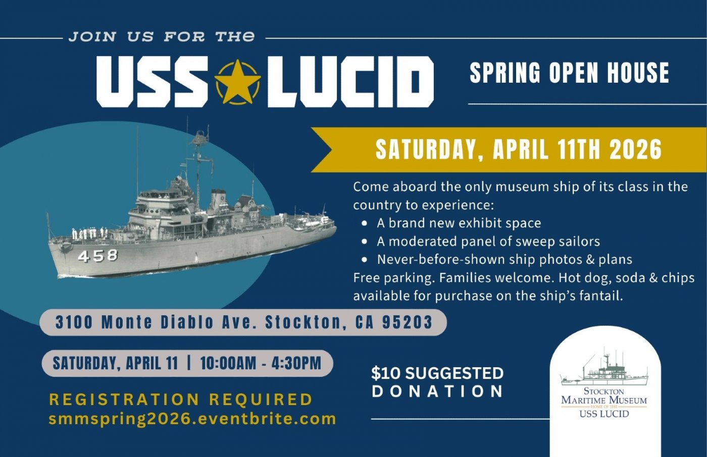 Join us Saturday, April 11, 2026 from 10 AM to 4:30 PM for a guided tour of the USS Lucid, a US Navy ship berthed right here in Stockton! This year we have several new features: at 12 PM and 2 PM, we'll hold a moderated Q&A panel with several sailors who served on this class of ship; we've also revamped our exhibit space with never-before-shared photos of Lucid at her builder's shipyard in Louisiana, information on minesweeper construction techniques, and more! We will also share plans for our museum's future permanent site on the Stockton Waterfront, and will have merchandise and naval history books available for purchase in our gift shop.